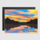 Un canot traversant un lac de montagne reflétant les belles oranges et les bleus d'un coucher de soleil coloré. Ajoutez votre propre texte.