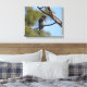 Das Schwarze Phoebe, Sayornis Nigricans, "Fliegenfänger". Schwarzer Vogel mit weißem Unterbauch sitzt auf bloßem Baumzweig. Hellblauer Himmel und diffuse Bäume im Hintergrund.