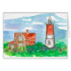 Eine leere Notizkarte mit dem Leuchtturm Nauset auf Cape Cod, Massachusetts mit hellrotem Dach und wütenden lila Wildblumen illustriert mit Tinte und Aquarell.