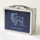 Lunch box featuring the symbol for Capricorn in soft silver blue, overlaid with the stars of the constellation, against a starry sky background graded from deep midnight blue to black.
