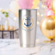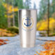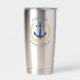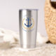 Personalisierte nautische Themen, rostfreier Stahl, isolierte Tumbler mit "Captain" (oder einem anderen Rang oder Titel) und Ihr Bootsname, Familienname oder anderer gewünschter Text. Dieses Design besticht durch einen maßgeschneiderten Bootanker in Marineblau, der mit einem goldfarbenen Stern und Blätter aus Regalgold Akzent gesetzt wurde.