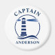 Stilvoll runder Kühlschrank Magnet mit Kapitän oder anderem Titel, Ihr personalisierter Name und ein individueller klassischer Leuchtturm mit Meereswellen in Marineblau auf Weiß oder wählen Sie Hintergrundfarben, um Ihre Einrichtung. Macht ein großartiges, einzigartiges Geschenk.