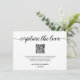 Die "Custom QR Code Wedding Foto Sharing Card" ist eine personalisierte und bequeme Möglichkeit, um die Gäste zu ermutigen, ihre Fotos von einem besonderen Tag an zu teilen. Diese Karte enthält einen benutzerdefinierten QR-Code, den Sie scannen können, um auf Ihre Hochzeitsplattform für Fotos zuzugreifen. Passen Sie alle Details an, um diese Karte einzigartig zu machen. Einfaches, schwarz-weißes Design, das Sie mit einer Nachricht neben dem QR-Code personalisieren können. Der individuelle QR-Code macht es den Gästen einfach, ihre Fotos zu teilen, um so jeden wertvollen Moment aus Ihrer Feier zu erfassen. Dieses Foto-Sharing-Card eignet sich hervorragend zur Verbesserung Ihres Hochzeitserlebnisses und zur Aufnahme von Erinnerungen. Es verbindet Stil und Funktionalität nahtlos miteinander. Machen Sie eine Aussage mit dieser einzigartig gestalteten Karte, die eine Touch der Bequemlichkeit zu Ihrem Hochzeitsspiel Foto Sharing Bemühungen.