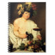 Caravaggio Bacchusnotizbuch. Ölmalerei auf Leinwand ab 1595. Bacchus ist eine von italienischen Künstler Caravaggios berühmtesten Malereien. Die Arbeit kennzeichnet einen jungen Mann, der als der klassische Gott Bacchus mit Blätter und Trauben in seinem Haar und in einer Schüssel Frucht sitzend vor ihm gekleidet wird. Berühmt malen enthält einen Wein Carafe, in dem das Bild des Malers an seinem Gestell gesehen werden kann. Das Weinglas die Griffe des jungen Mannes enthält ebenfalls seine Reflexion. Ein großes Geschenk für Fans von Caravaggio, von barocker Kunst, von Mythologiemalereien und von Wein.