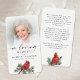 This comforting memorial sympathy card features a softly faded photo paired with elegant script typography and a vibrant red cardinal perched on evergreen branches. Often viewed as a symbol of hope and remembrance, the cardinal adds warmth and meaning to this design. The back shares a heartfelt message of love and reflection, making this card a thoughtful keepsake for a funeral, memorial service or Celebration of Life as family and friends honor a life that will never be forgotten. Its small and portable size of 3.5x2" (wallet-sized) makes it convenient for loved ones to carry it with them as a reminder of your loved one’s life and spirit. Personalization makes each card unique.