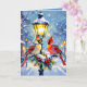 A beautiful Christmas card with an impasto style ai illustration of a female and male cardinal sitting on a lamppost on a snowy winter night. A back drop of a cute festive street and village. On the inside of the card you can add your own custom message in the personalize area.