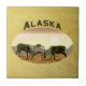 Zwei Karibu-Bullen ringen während des Sturzes rutschen im Norden, während die Sonne im Hintergrund Sets. Es erscheint auch das Textlesen "Alaska". Das Bild ist auf einem braunen Lederhintergrund überlagert.
