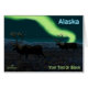 Deux caribous de taureau (Rangifer tarandus), c'est-à-dire des rennes, marchent la nuit dans la toundra pendant qu'ils migrent vers le sud pour l'hiver. Le givre est sur le sol et les aurores boréales brillent au-dessus de montagnes lointaines. Texte "Alaska" apparaît en bleu et blanc brillant Ajouter votre propre texte supplémentaire.