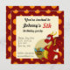 Invitations imprimés d'anniversaire avec l'illustration d'un dragon rouge gardant un trésor. Illustration de Maxi Harmony