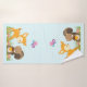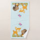 Serviettes de bain avec une mignonne illustration montrant un cerf de bébé et un petit écureuil tenant une glande et un papillon volant au-dessus de leur tête. Ces adorables créatures boisées se tiennent debout sur une herbe avec quelques champignons fantaisistes à leurs pieds. Arrière - plan bleu clair.