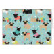Cute birthday party Pug dogs with black and tan coats dressed in cute birthday outfits with balloons, cake and confeti pattern.