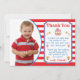Venez un, venez tous ! Merci à tous d'être venus à la plus grande fête d'anniversaire sous le grand chapiteau avec nos modèles de carnaval de cirque. Ce étiquette d’anniversaire de carnaval de cirque présente un arrière - plan de tente de cirque avec carrousel rouge et bleu sur une carte de remerciements personnalisée avec la photo de votre enfant.