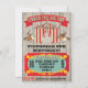 Super mignon, rustique "sous le grand chapiteau" cirque ou fête d'anniversaire de carnaval. Des acrobates montent à cheval, une grande tente rayée, des bannières et un billet VIP pour la fête d'anniversaire contre un arrière - plan lambrissé. L'arrière est décoré d'un éléphant se balançant sur un ballon. Illustration tirée à la main par McBooboo.