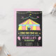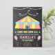Éblouissez vos invités avec cette mignonne invitation de fête d'anniversaire à thème carnavalesque avec une tente de cirque et des bonbons en coton rose avec typographie pastel contre un arrière - plan en tableau noir. Ajoutez simplement les détails de votre événement sur ce modèle facile à utiliser pour en faire une invitation unique. Retournez la carte pour révéler un motif rayé rose et blanc au dos de la carte.