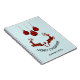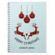 Un carnet personnalisé qui dit "Joyeux Noël" en texte courbe. Conçu avec une illustration de 2 cerfs de Noël sautant. Les cerfs sont faits de sériole rouge et noire, avec un peu de coeur entre eux. Les décorations de Noël en plaid rouge et noir sont accrochées au sommet. Arrière - plan bleu clair.