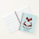 Un carnet spiral personnalisé qui dit "Joyeux Noël" en texte courbe. Conçu avec une illustration de 2 cerfs de Noël sautant. Les cerfs sont faits de sériole rouge et noire, avec un peu de coeur entre eux. Les décorations de Noël en plaid rouge et noir sont accrochées au sommet.