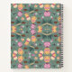 A spiral-bound notebook with a playful pattern featuring colorful tea cups, teapots, cups of coffee, and desserts on a teal background. The design, seen on both the front and back, exudes a fun, whimsical tone, evoking a cozy, inviting atmosphere.