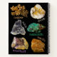 Photographies de cuivre dendritique, moitié géode, mica muscovite, malachite vert, cristaux améthystes mauve et barite huppée. Toutes ces roches sont ou contiennent des minéraux.