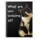 Chat noir et blanc avec le slogan d'attitude "Que regardez-vous ?" sur le carnet en spirale.