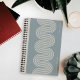 Created to coordinate with the "Lombard" art and stationery collection, this spiral-bound notebook was inspired by San Francisco's Lombard Street, which is known as the "Crookedest Street in the World." The notebook features 7 ivory-colored lines arranged in a winding pattern, and placed over a blue background. There is space for the customer's name on the bottom-right side, and the phrase "Daily Notes" appears in the top-right corner. This text can be customized or removed altogether. The back of the notebook features a coordinating wavy line pattern. The design is minimalistic, yet bold, and would be a perfect gift for men and women alike.