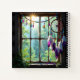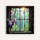 Personalized notebook. A rustic window with a purple feathered dreamcatcher hanging in the window along with colorful sparkly crystals. The window overlooks a beautiful array of trees and sunbeams shining through.