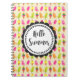 Un carnet en spirale avec l'image d'un motif d'été de popsicles et de crème glacée en aquarelles. Bonjour été écrit dans une police tendance amusante dans un cadre lunatique rond.