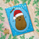 Adorable drôle mignonne joyeux patate de dessin animé brun portant un chapeau de Père Noël rouge et blanc. La pomme de terre est dans un style d'art cartoon et marron coloré, il a des bras et des doigts en bâton et un grand sourire heureux avec des points pour les yeux. Le chapeau de Père Noël sur sa tête est rouge avec une garniture blanche et un pompon blanc suspendu. Il est à l'intérieur d'une forme ovale bleu clair avec un cadre bleu foncé et deux feuilles verts saints avec deux baies rouges au sommet de l'ovale. La couleur arrière - plan est un bleu clair vif avec des flocons blancs qui flottent sur le bord pour donner une ambiance festive à ces mignons carnets saisonniers.