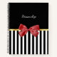 Un élégant bloc-notes de taille standard de 8,5x11'' avec des rayures verticales en noir et blanc, agrémenté d'une bande élégante couleur or FAUX et d'une image d'un arc de style ruban rouge. Personnalisez-le en ajoutant le nom de cette fille spéciale dans votre vie. Image imprimée plate, NON métallique ou arc réel.