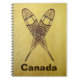Une paire croisée de raquettes sur un arrière - plan en cuir de cerveau. Le texte personnalisable "Canada" apparaît également. Il existe plusieurs styles de raquettes traditionnelles. Les images ici sont faites de babiche (sangle) en cendres et en peau de mousson dans le motif de l'Alaska. Plus longue et plus fine que d'autres styles, comme la patte roulante, les raquettes de l'Alaska permettent une porte plus naturelle et conviennent parfaitement aux voyages de fond. Les pointes légèrement retournées vous permettent de faire glisser un peu vos pieds. Il est conseillé de faire des raquettes pour d'excellents ciels, généralement au pire moment possible.