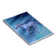 Un cheval blanc de neige avec des sabots glacés galop à travers la neige tombante laissant un sentier de flocons de neige.