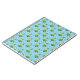Repeat pattern of light and dark green Christmas trees decorated in baubles and tinsel. Each with a bright yellow star on the top. Multi-colored snowflakes are dotted around on a light blue background.