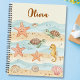 Ce cahier personnalisé présente des créatures marines bébé adorables - étoiles de mer, tortues et hippocampes - sur fond de motifs de vagues douces et de sable doux. Ce design ludique présente des bleus pastel apaisants, des tons de sable chaud et des accents de corail.