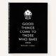 Carnet de recettes chic en noir et blanc avec "les bonnes choses viennent à ceux qui font la cuisson" écrit sur la couverture dans une police moderne sous un cupcake blanc avec glaçage décoré de petits coeurs. Personnalisez avec votre nom.
