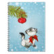 Un carnet drôle et mignon avec un thème de noël. Un chat siamois blanc espiègle et ludique. Elle regarde une décoration d'arbre de noël accrochée à une branche de pin qui se demande si elle devrait être coquine et jouer avec ou non. Placez-vous sur un arrière - plan bleu avec des flocons de neige blancs.