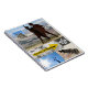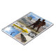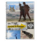 Un carnet avec une couverture qui comporte plusieurs photos de l'itinéraire de pèlerinage de Camino De Santiago, y compris des photos d'un waymark de coquille de feston, d'une statue de pèlerin, de la cathédrale de Santiago, d'une flèche jaune, d'une croix de St James, et des bottes de randonnée.