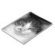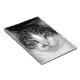 Photographie en niveaux de gris d'un chat en forme de tabby et blanc recadré pour montrer le closeup of face.