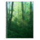 Les rayons du soleil matinal se répandent dans une forêt estivale d'une verdure éclatante, avec des arbres massifs recouverts de lierre et une épaisse couverture de sous-bois. Une photographie numériquement manipulée pour donner aux feuilles de la vigne, de la brume bleu-vert, des rayons dorés et des arbres verts printaniers une qualité de rêve.