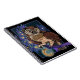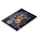 Jolie petite chouette dans un arbre plein d'étoiles tient un pendentif de lune mystique. Art par Erin Cooper