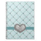 Prenez les notes avec ce joli et sophistiqué le carnet de notes à spirale piqué de coeur de fausse pierre de bleu verdâtre par faux hued léger qui peut être personnalisé avec votre initiale ou monogramme. Ce beau journal décoré d'un monogramme avec un motif bling de croix et de diamant de criss est élégant et élégant avec son ruban et pendentif et broche en forme de coeur d'argent comme la conception. Illustration et © Chrissy H. Studios, LLC de conception. Tous droits réservés.