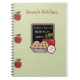 Utilisez ce carnet mignon et créatif de thème de pomme pour maintenir tout votre favori, recettes, liste ou juste un endroit pour prendre notes des notes. Ce carnet orienté de pomme comporte un arrière - plan de vert sauge avec une épine verte de plad s'enveloppant juste au-dessus du bord avant et au-dessus du dos du livre. L'avant montre un thème mignon de pomme comprenant les pommes, la tarte aux pommes et un panneau de craie. Customisez votre carnet avec votre propre texte utilisant le modèle de mots des textes.