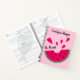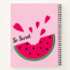Ce joli carnet rose est conçu pour contenir vos recettes. Il est décoré d'une seule image d'une tranche de pastèque rouge vif et juteuse avec une morsure, et d'un motif de coeurs qui s'éclate. L'arrière - plan est rose pâle et peut être personnalisé avec vos mots et votre nom. L'arrière du carnet a également le design de la pastèque.