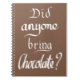 Ce carnet de typographie de mot amusant présente l'une des questions les plus importantes que l'on puisse se poser : "Est-ce que quelqu'un a apporté du chocolat ?" Cette Citation marron chocolat drôle est idéale pour le chocoholic de votre vie. Citation brun chocolat manuscrite humour avec slogan et design de The Sweetmans