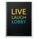 Live Laugh Lobby Carnet - noir Faites passer le mot sur votre passe-temps qui sauve la planète - lobbying - avec ce carnet de "Live Laugh Lobby". La plupart des gens s’inquiètent du changement climatique, mais ils ne savent pas quoi faire. La réponse ? Lobbying. Lorsque les citoyens organisent et contactent leur lobby élu pour le bien de la planète, les lois climatiques sont adoptées.