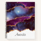 Un carnet en spirale personnalisé avec un design abstrait avec des couches bleues et violettes avec des rubans en feuille d'or imitant entre les deux.