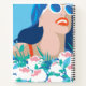 Femme rétro avec fleurs et soleil et lunettes de soleil, rouge à lèvres brillant et cheveux foncés. Quelle scène de plage ensoleillée et colorée sur un journal en spirale.