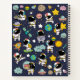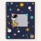 Icônes amusantes d'astronaute et de galaxie sur un fond étoilé marine foncé.