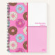 The artist's pattern design of frosted doughnuts is on the side of the notebook, front and back. On the other is a white and pink square with a pink line in the middle. And the texts can be personalized by the customer.