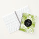 Un carnet en spirale avec un motif extensible de grands feuilles de palmiers sur un arrière - plan vert olive. Moderne tendance et tropical. Un cercle noir avec une bordure intérieure dorée superposée avec vos détails personnalisés à l'intérieur.
