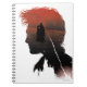 Harry Potter est en silhouette avec une image de Voldemort lors de la bataille de Poudlard, lançant un sortilège de mort sur Harry lors de leur duel final.