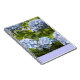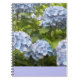 Des hydrangées d'un bleu profond nichées au milieu d'un feuillage vert vif et feuillu. Une bordure bleu clair sur le fond du livre.